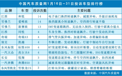 中國(guó)汽車質(zhì)量網(wǎng)2012年1月下半月投訴排行