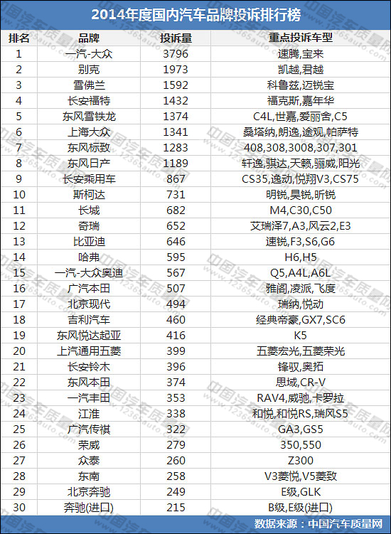 2014年度國(guó)內(nèi)汽車品牌投訴排行榜