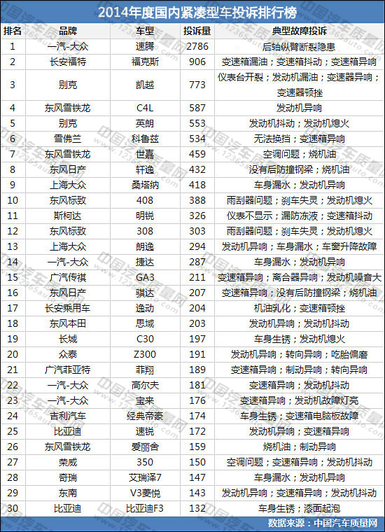 2014年度國(guó)內(nèi)緊湊型車投訴排行榜