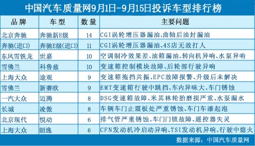 在本時間段內(nèi)(2012年9月1日~15日),中國汽車質(zhì)量網(wǎng)(m.asheng.net.cn)接到消費者針對汽車產(chǎn)品的投訴總計365宗,共涉及140款車型,兩項數(shù)據(jù)相比8月下半月有所下降。 奔馳E級渦輪增壓器普遍漏油 車主不滿解決方案 9月3日,中國汽車質(zhì)量網(wǎng)發(fā)表E級車...