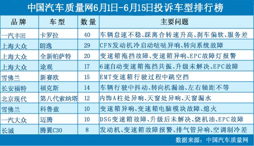 中國(guó)汽車質(zhì)量網(wǎng)2012年6月上半月投訴排行