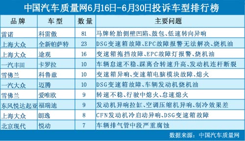 在本時(shí)間段內(nèi)(2012年6月16日~30日),中國(guó)汽車質(zhì)量網(wǎng)(m.asheng.net.cn)接到消費(fèi)者針對(duì)汽車產(chǎn)品的投訴總計(jì)508宗,相比6月上半月有所上升,共涉及129款車型。 雷諾科雷傲首次上榜成榜首 6月下半月,中國(guó)汽車質(zhì)量網(wǎng)收到大量關(guān)于進(jìn)口雷諾科雷傲[相關(guān)...