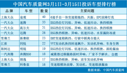 中國(guó)汽車質(zhì)量網(wǎng)2012年3月上半月投訴排行