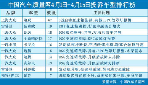 中國(guó)汽車質(zhì)量網(wǎng)2012年4月上半月投訴排行