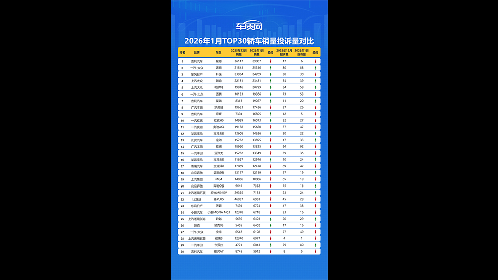- 2026年1月TOP30轎車(chē)銷(xiāo)量投訴量對(duì)應(yīng)點(diǎn)評(píng)2026-02-26 08:30