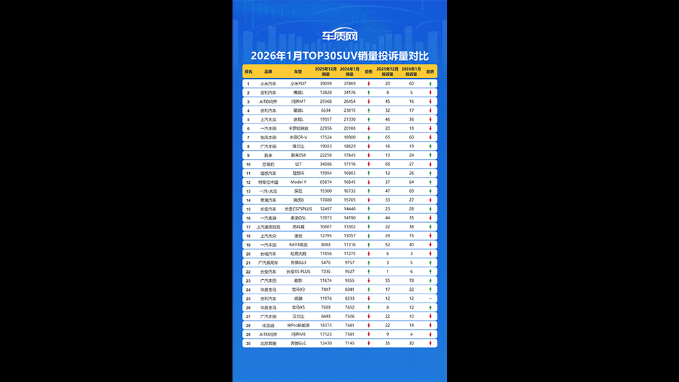 - 2026年1月TOP30 SUV銷(xiāo)量投訴量對(duì)應(yīng)點(diǎn)評(píng)2026-02-27 08:30