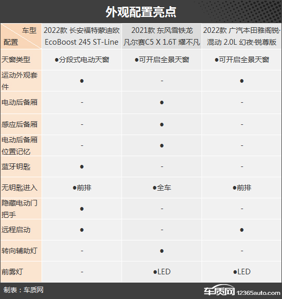 外部配置方面,蒙迪歐和雅閣在原有設(shè)計(jì)的基礎(chǔ)上均配備了外觀套件,進(jìn)一步強(qiáng)化運(yùn)動(dòng)視覺效果。功能部分,凡爾賽C5 X整體表現(xiàn)最為厚道,不僅提供了同級(jí)別罕見的轉(zhuǎn)向輔助燈,還配備了較為實(shí)用的感應(yīng)后備廂和全車無(wú)鑰匙進(jìn)入。蒙迪歐更注重科技感與設(shè)計(jì)感,提供了隱藏式門把手和藍(lán)牙鑰匙,同時(shí)具有不錯(cuò)的實(shí)用性。雅閣整體表現(xiàn)中規(guī)中矩,不求有功但求無(wú)過。